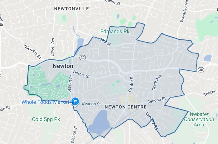 The zip code 02459 for Newton Center also encompasses the villages of Oak Hill, Oak Hill Park, and Thompsonville. For the purposes of this write-up, we are focused on the Center as outlined in the map above.